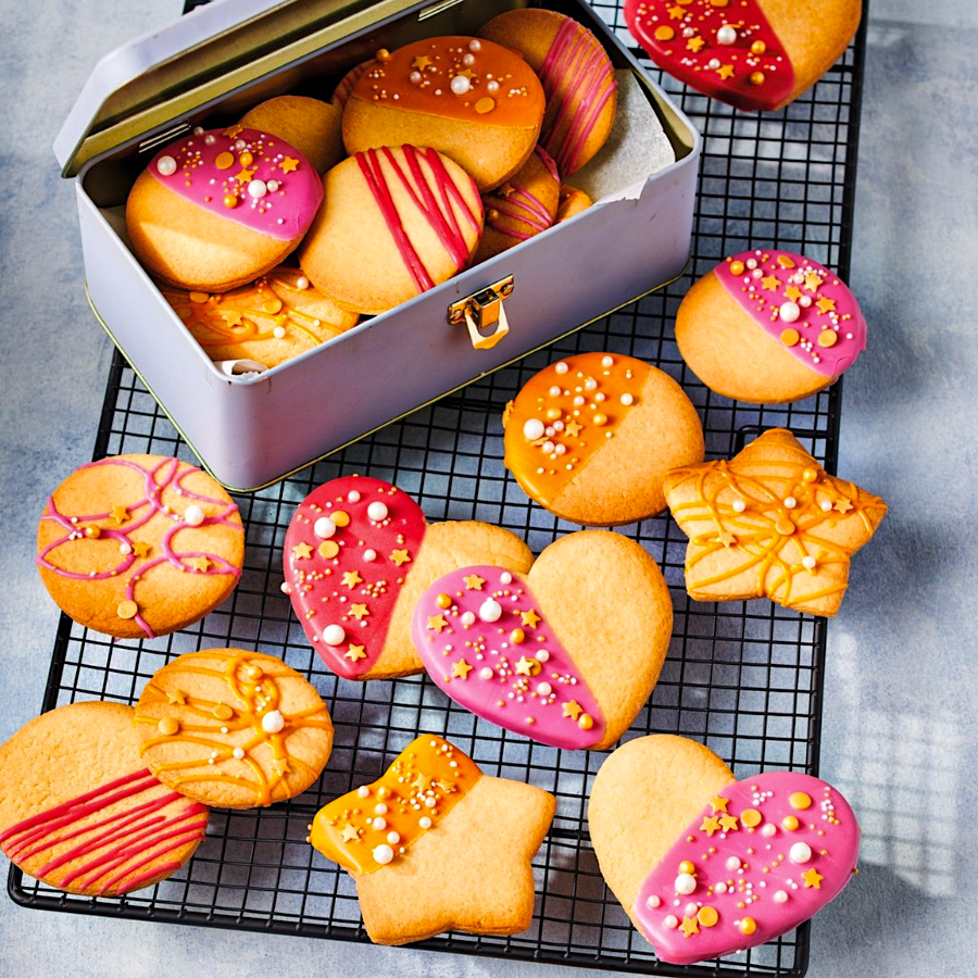 Precalienta el horno a 180°C (horno de convección 160°C). Estira la masa sobre una superficie enharinada (3 mm de espesor). Corta las formas de galleta. Hornea las galletas en el centro del horno durante unos 12 minutos, hasta que estén doradas. Deja enfriar las galletas y decóralas como desees.