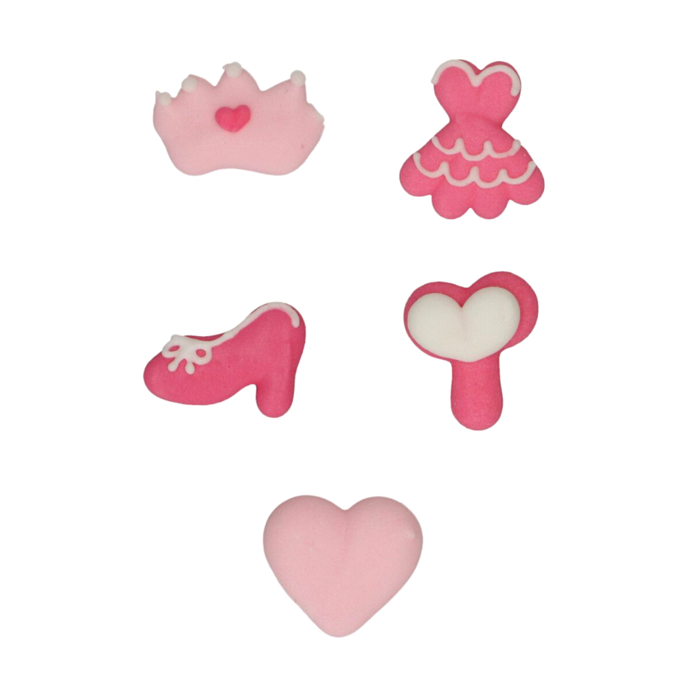 El set incluye 8 unidades: 2 coronas, 2 vestidos, 2 zapatos, 1 espejo y 1 corazón.