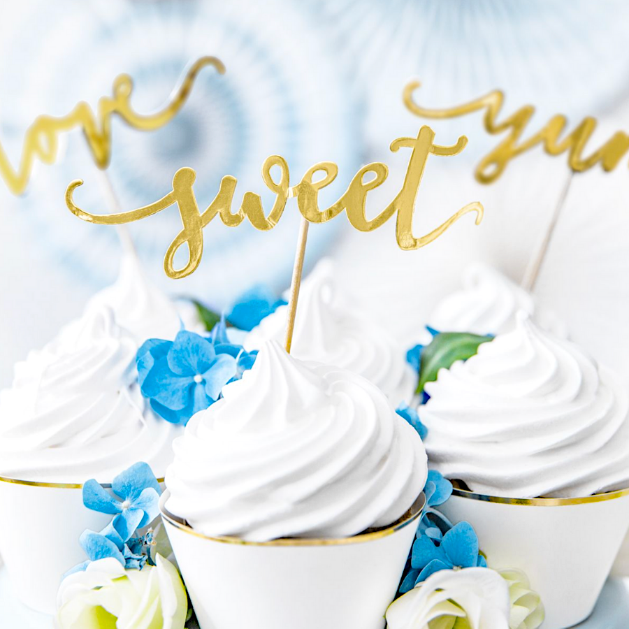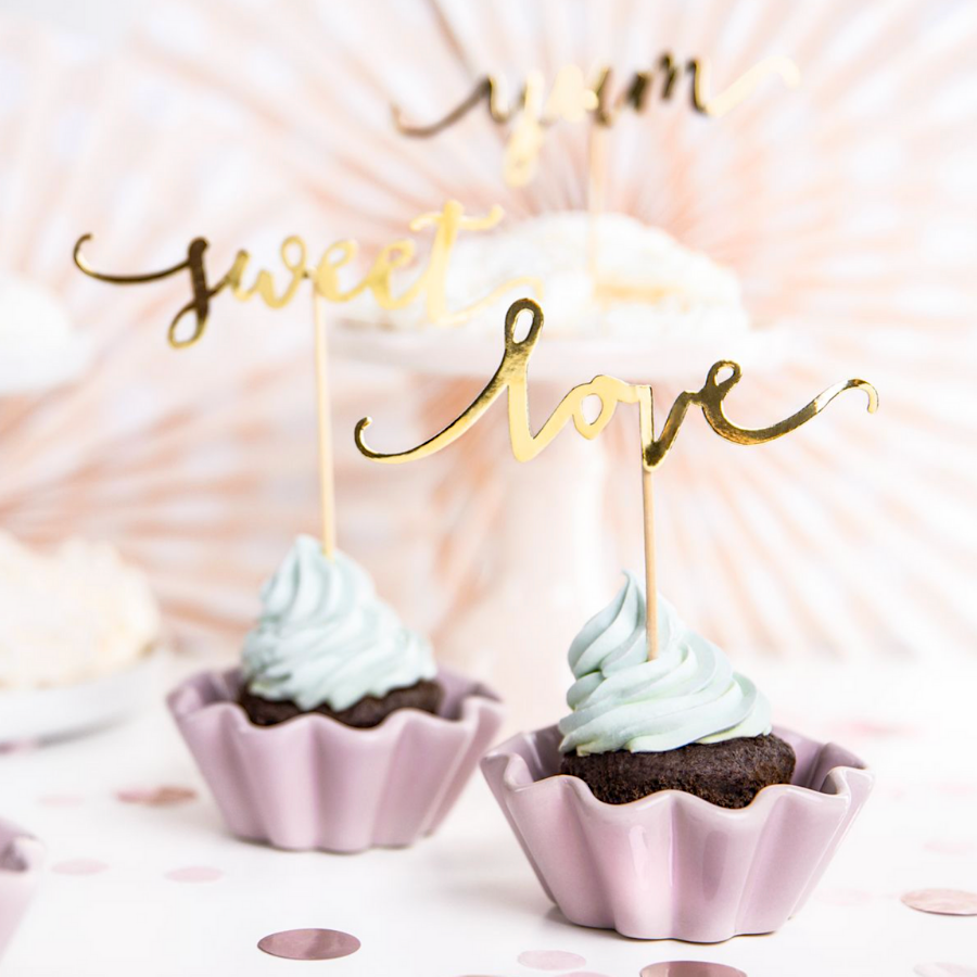 Incluye 6 toppers para cupcakes de PartyDeco, con 3 diseños distintos: Love, Sweet y Yum.